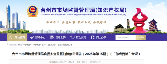 浙江省台州市市场监督管理局食品安全监督抽检信息通告(2025年第15期)(“你点我检”专项)