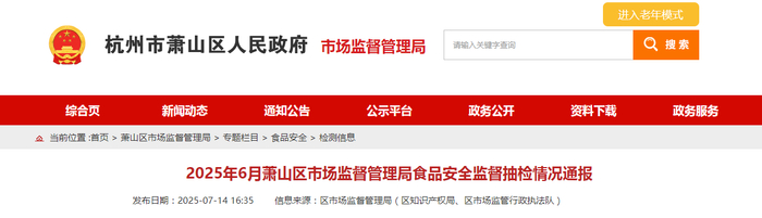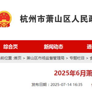 2025年6月杭州市萧山区市场监督管理局食品安全监督抽检情况通报