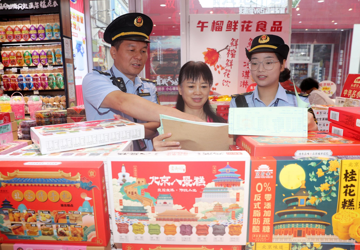 7月15日,北京市东城区市场监管局开展旅游景点、重点街区食品安全专项检查。执法人员重点检查旅游休闲食品、中华老字号食品和北京地方特色食品的生产日期、索票索证情况、进货台账记录以及是否存在商标侵权现象,确保游人买得放心、玩得开心。图为执法人员检查王府井大街一家食品商店。