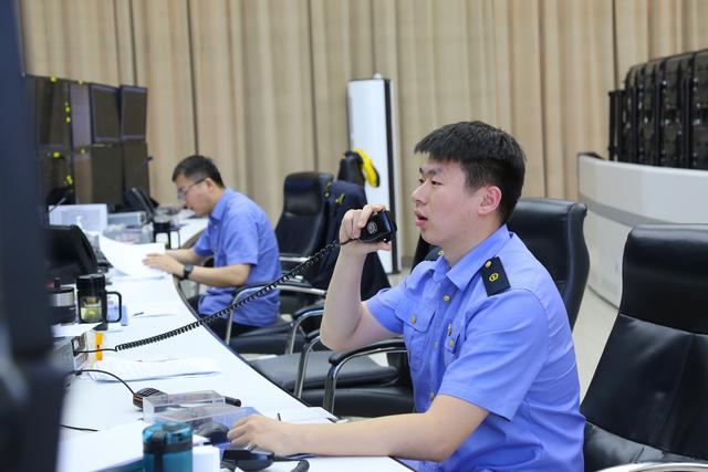 二连站调度指挥中心一名内勤助理值班员正在进行调车作业安全联控。