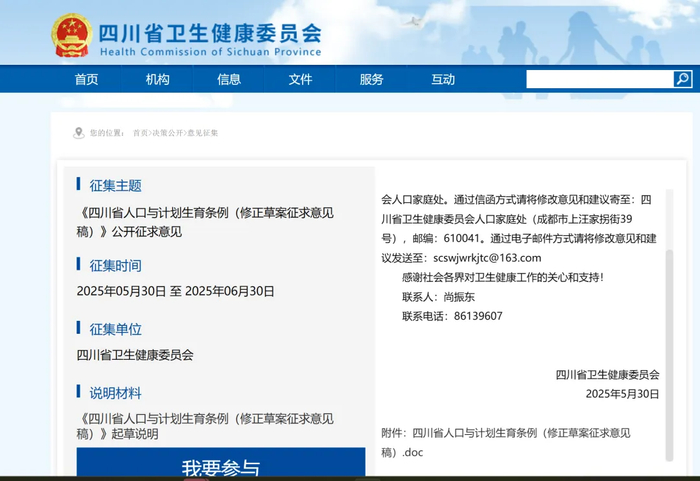 四川省卫生健康委员会官网发布了关于《四川省人口与计划生育条例(修正草案征求意见稿)》公开征求意见。