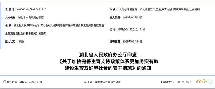 近期,湖北省人民政府办公厅发布了《关于加快完善生育支持政策体系更加务实有效建设生育友好型社会的若干措施》的通知,其中明确湖北省延长婚假至15天。