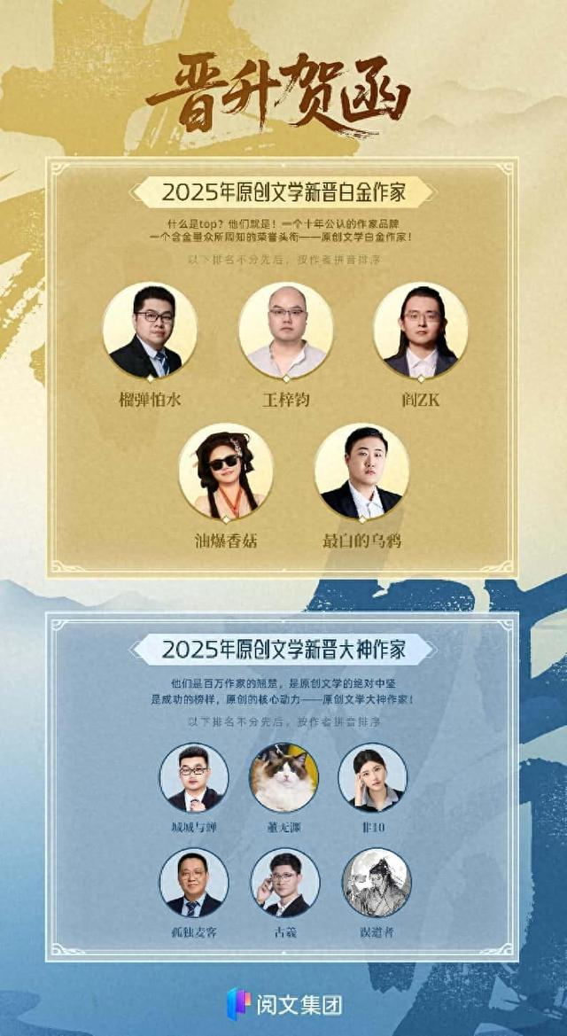 7月15日,阅文集团发布2025年度“白金大神”作家名单,榴弹怕水、王梓钧、阎ZK、油爆香菇、最白的乌鸦5名作者获“白金作家”称号,城城与蝉、董无渊、非10、孤独麦客、古羲、误道者6名作者获“大神作家”称号。其中,多位95后年轻创作者跻身顶尖作家序列,一书封“神”,持续彰显阅文作为网络文学创作高地的蓬勃活力。