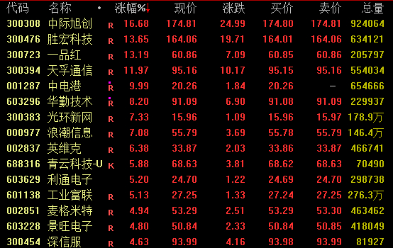 英伟达概念股盘中大幅走高,截至收盘,中际旭创涨近17%,胜宏科技、一品红涨超13%,天孚通信涨约12%,华勤技术、浪潮信息涨超7%。
