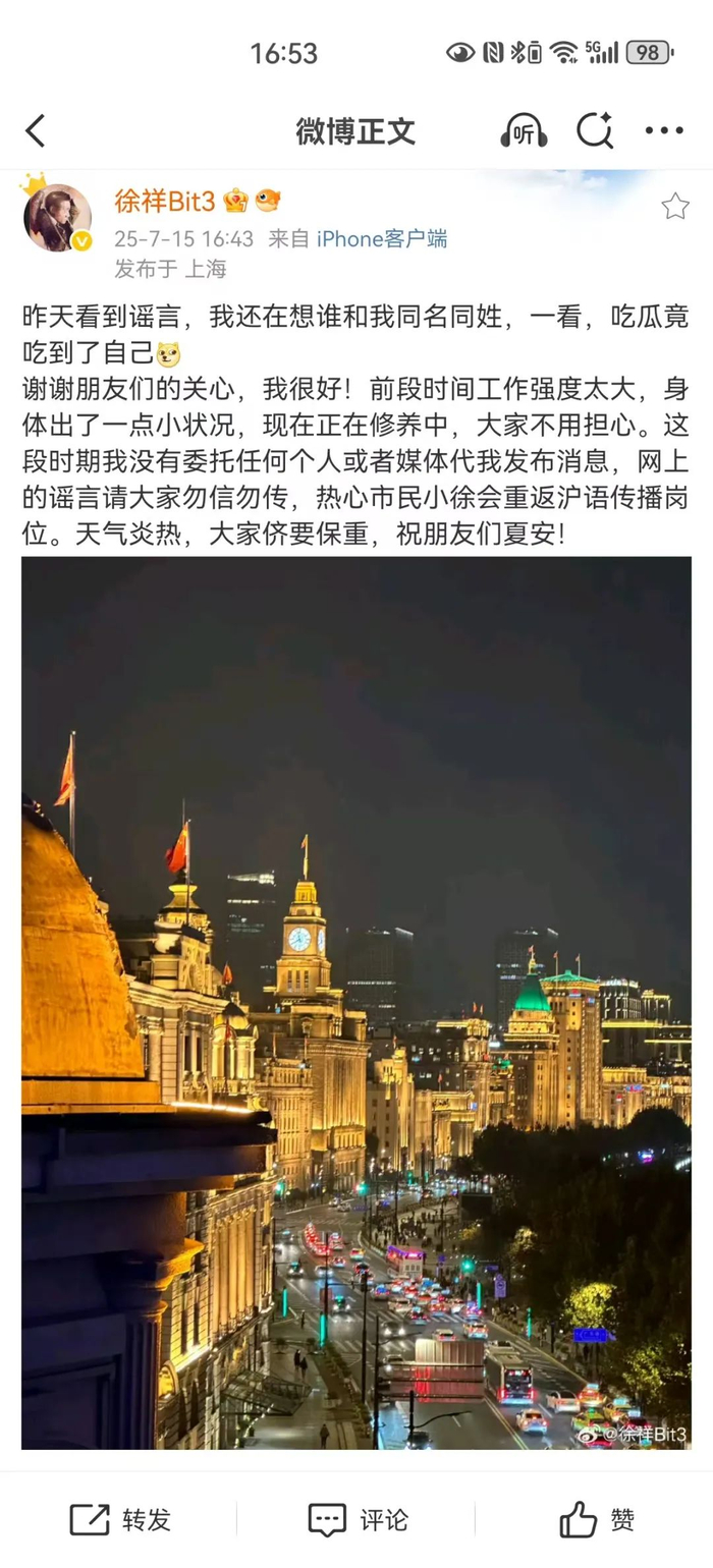 刚刚,知名沪语博主徐祥通过账号辟谣了