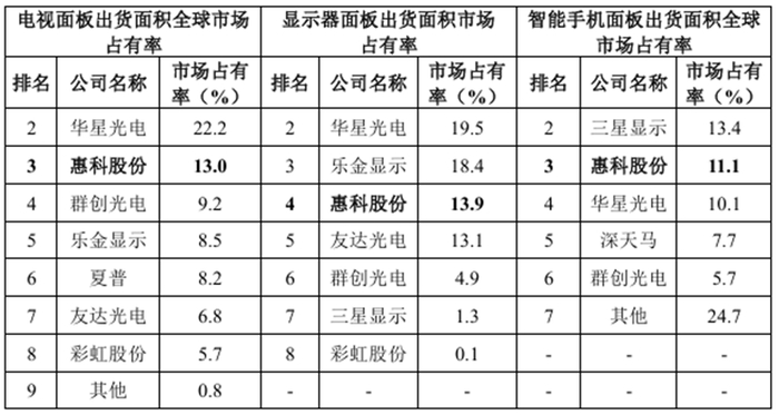 群智咨询数据显示,2024年度,惠科股份电视面板出货面积、显示器面板出货面积、智能手机面板出货面积分别位列全球第三名、第四名、第三名全球市场占有率均超过10%。