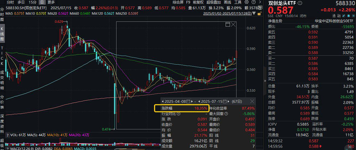 今日(7月15日)创业板指大涨1.73%,科创综指亦收红(0.32%),覆盖创业板+科创板高成长龙头的双创龙头ETF(588330)场内涨幅最高上探2.61%,收涨2.26%,彰显高弹性魅力!