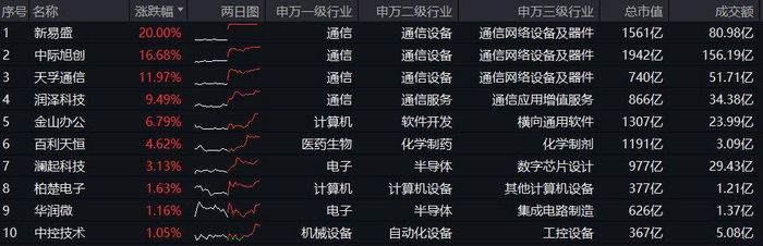 成份股方面,光模块三剑客领衔大涨!新易盛20CM涨停,股价再创新高,中际旭创涨超16%,天孚通信涨近12%;AI应用概念股金山办公涨超6%;医药生物龙头百利天恒涨逾4%;半导体龙头澜起科技涨超3%。
