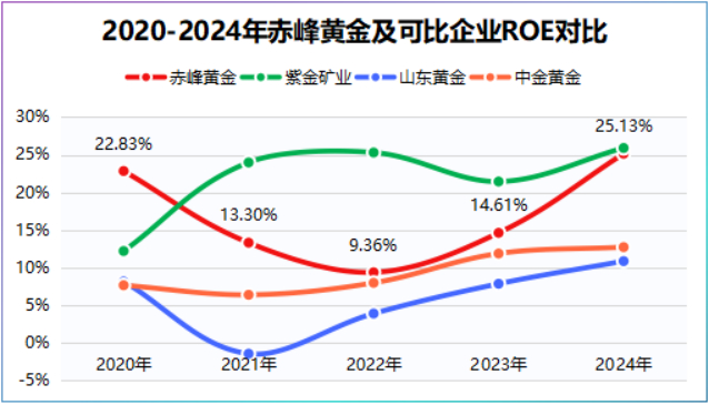 尤其是2022年以来,赤峰黄金ROE从不到10%提高到了2024年的25.13%,远高于山东黄金、中金黄金等同行,甚至超越了片仔癀。