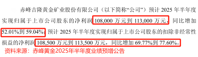 就在7月14日,赤峰黄金公布了2025年半年度业绩预增公告,预计上半年公司将实现净利润10.8亿元到11.3亿元,同比增长约52.01%~59.04%。
