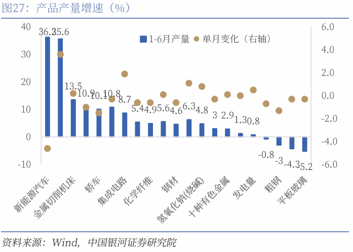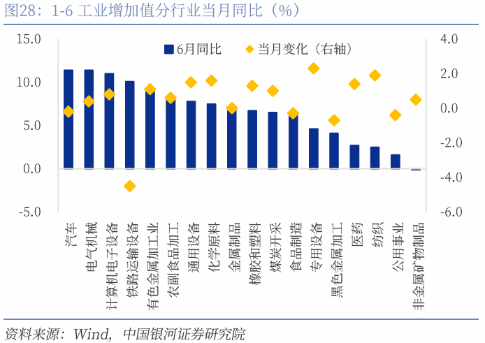 “抢出口”和“抢两新”带动整体工业增加值。一方面,关税政策反复下抢出口效应仍在延续。中美“日内瓦协议”约定90天的缓冲期,使得美国进货商今年的“圣诞备货”或前移至6-7月。彭博数据显示,6月从中国发往美国集装箱船数量日均为66艘,5月日均数量为49.6艘,环比增加33%;运价指数上看,6月至美西、美东航线的CCFI环比分别大涨 28.4%、39.1%,涨幅较5月分别上行15.7和22.7个百分点。同时转口贸易增速或边际上行,6月份我国对东盟出口增速16.8%(前值14.8%),其中对泰国、越南、菲律宾和马来西亚出口增速分别为27.9%、23.8%、10.2%和9.9%,较上月分别上行6.3、1.7、2.7和4.6个百分点,同时6月份越南出口增速19.3%(前值20.7%),连续三个月维持20%左右的高增长,我国对非美国家转口贸易边际上行。另一方面,“两新”政策虽然仍在发挥效果,618购物节再度推高了“两新”行业生产。从分行业工业增加值来看,汽车、电气机械和计算机电子设备增速最快,同比增速分别为11.4%、11.4%和11%。这三个行业都同时兼顾出口、政策和新质生产力三大属性,虽然侧重点或有不同,但仍对应“三抢”的三个领域。同时从产品产量来看,增速最快的三个产品为新能源汽车、工业机器人、金属切削机床,1-6月增长分别为36.2%、35.6%和13.5%。