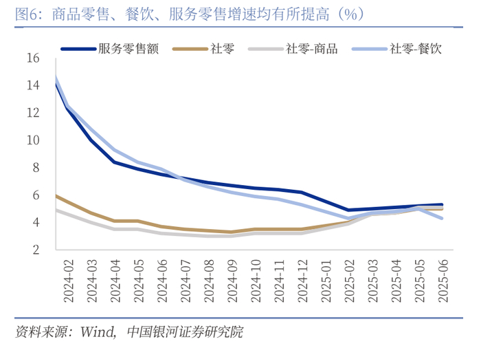 综上,6月社零增速下滑主要有三方面原因:其一,以旧换新补贴节奏上有所把控;其二,居民前置更换耐用品对后续消费的拖累效应逐渐显现;其三,餐饮收入同比增速下滑相对显著。展望未来,尽管6月增速放缓,但政策面(以旧换新接续资金7月份下达)和消费升级趋势(如新消费、服务消费增长)有望对下半年消费增速形成支撑。