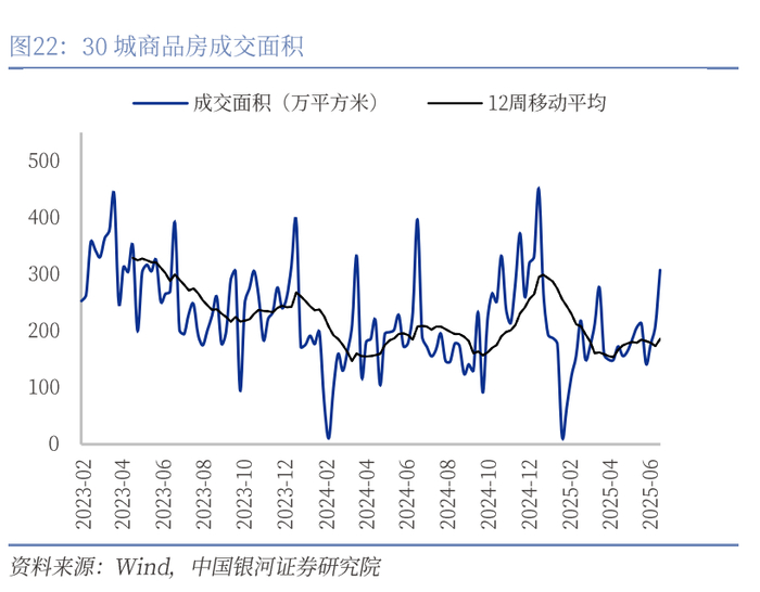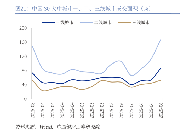商品房销售量价继续走弱。销售端,6月商品房销售面积降幅扩大,1—6月份,新建商品房销售面积45851万平方米,同比下降3.5%;其中住宅销售面积下降3.7%(前值-2.6%)。1-6月新建商品房销售额44241亿元,下降5.5%;其中住宅销售额下降5.2%(前值-2.8%),量价均下滑。不过从高频数据30大中城商品房销售来看,一、二线城市均在6月底出现了一波趋势向上。