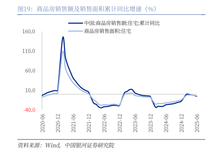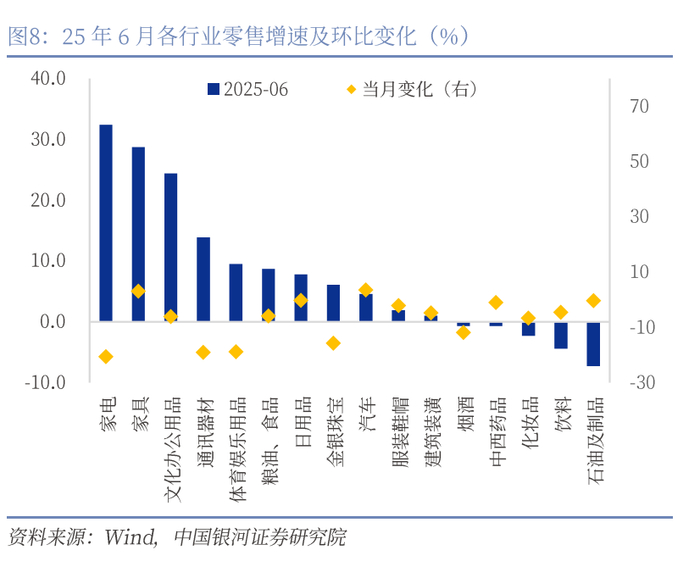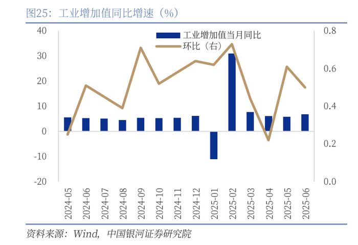 工业:工业增加值6月增长明显,“抢出口”和“抢两新”效应加强。6月工业增加值录得6.8%,增速较为强劲。我们认为“抢出口”和“抢两新”带动整体工业增加值。一方面,关税政策反复下抢出口效应仍在延续。中美“日内瓦协议”约定90天的缓冲期,使得美国进货商今年的“圣诞备货”或前移至6-7月。6月从中国发往美国集装箱船数量日均为66艘,环比增加33%;运价指数上看,6月至美西、美东航线的CCFI环比分别大涨 28.4%、39.1%。同时转口贸易增速或边际上行,6月份我国对东盟出口增速16.8%(前值14.8%),同时6月份越南出口增速19.3%(前值20.7%),连续三个月维持20%左右的高增长。另一方面,“两新”政策虽然仍在发挥效果,618购物节再度推高了“两新”行业生产。从分行业工业增加值来看,汽车、电气机械和计算机电子设备增速最快,同比增速分别为11.4%、11.4%和11%。同时从产品产量来看,增速最快的三个产品为新能源汽车、工业机器人、金属切削机床,1-6月增长分别为36.2%、35.6%和13.5%。