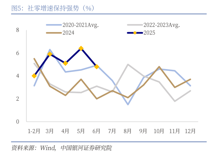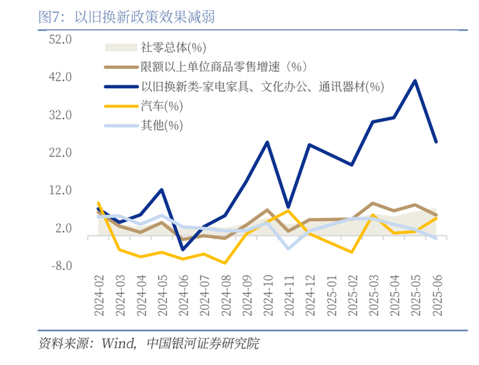 以旧换新补贴节奏上有所把控,资金接续暂缓导致6月政策拉动作用减弱。以旧换新政策在今年1-5月显著提振耐用品消费,但6月补贴资金使用进度放缓,支持消费品以旧换新的前两批共1620亿元超长期特别国债资金已按计划分别于1月、4月下达,我们此前估算1-5月已使用补贴金额1550亿元以上,此前下达的资金在5月已几乎用尽,而国家发展改革委在6月26日举行的新闻发布会上介绍,今年第三批消费品以旧换新资金将在7月下达,以旧换新政策接续在6月出现暂缓,对消费支撑力度减弱。