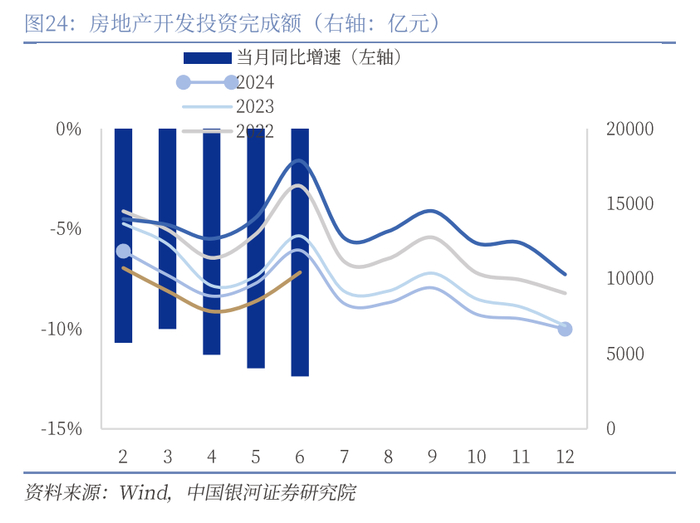 消费:受到政策和促销节奏等多因素扰动。6月社零同比增长4.8%,增速有所回落但与前月较去年提高幅度大致相当,商品零售累计增速与前值持平。6月当月餐饮收入大幅下滑5个百分点至0.9%,服务零售额增速为5.3%,保持平稳上升态势。6月社零增速下滑主要有三方面原因:其一,以旧换新补贴节奏上有所把控;其二,居民前置更换耐用品对后续消费的拖累效应逐渐显现;其三,餐饮收入同比增速下滑相对显著。展望未来,尽管6月增速放缓,但政策面(以旧换新接续资金7月份下达)和消费升级趋势(如新消费、服务消费增长)有望对下半年消费增速形成支撑。