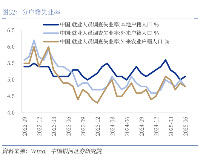 生产的强劲提升外来用工需求。6月城镇户籍失业率和外来户籍失业率产生分化,其中本地户籍调查失业率从5.0%上涨到5.1%,而外来户籍人口和外来农业人口失业率均有所下降,分别降0.2pct和0.1pct均至4.8%。我们认为最主要的因素就是6月“抢出口”和“强两新”较大幅度的拉动了工业生产水平,因此加大了外来户籍人口的劳动用工需求。但另一方面,本地户籍失业率的下降或也表示了内生动力的不足。