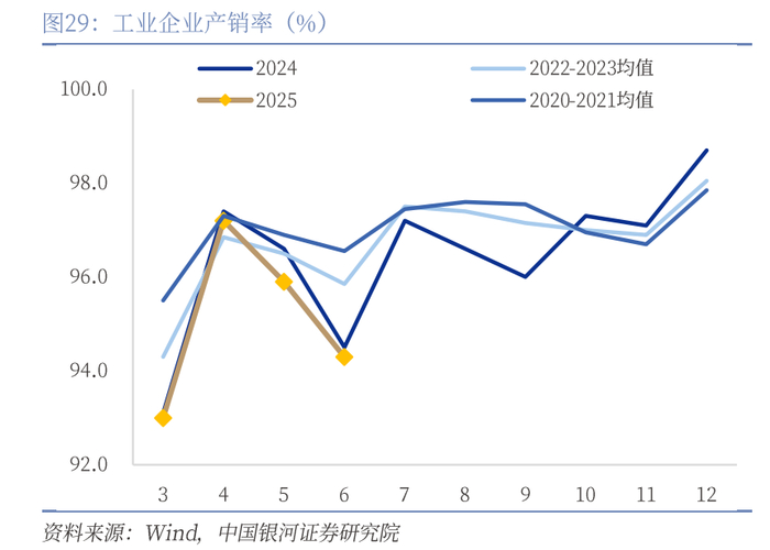 产销下降明显,需求的扩张没有跟上较高的工业生产。6月产销率为93.3%,较前值下降1.6pct。不仅如此,6月的产销率是近几年来的最低值,结合社零数据基本稳定来看,6月生产超出需求较多。可能有因高温天气在7-8月生产淡季到来前提高备货的可能,也可能是由于618需求前值推高了5月的生产和销售,导致企业错估了6月的实际需求。