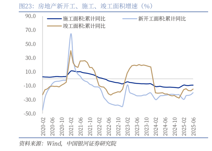 制造业:投资下滑较大,设备更新仍保持高增。1-6月制造业投资边际下滑1pct至7.5%,下滑幅度较大。分领域来看,设备更新仍在拉动制造业投资,1-6月设备工器具购置投资增速为17.3%(前值17.3%);而建筑安装工程和其他费用录得0.1%和1.3%。一方面“反内卷”倡议或已经影响企业投资决策,因为制造业投资影响的是企业未来的产能,而如果企业对未来预期不稳定,或是由于政策等信号让企业对投资保持观望态度,就会减少投资扩产。另一方面,长期需求的不稳定也影响企业进一步加大投资的预期,尤其是制造业企业中大部分为民营企业,对预期波动更为敏感。因此在扩大生产有关的建筑安装和购置新土地方面同比增速均下滑,仅维持受补贴和政策利好的设备更新投资。
