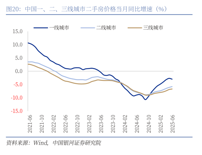 价格端,一线城市二手房价格掉头向下,6月70大中城市一、二、三线二手房价格当月同比分别为-3%(前值-2.7%)、-5.8%(前值-6.1%)和-6.7%(前值-6.9%),虽然二三线城市二手房价格降幅仍在收窄,但一线城市已经结束收窄态势,增速趋势掉头向下。但新房价格方面,一线城市仍保持收窄态势,一、二、三线分别为-1.4%、-3%和-4.6%,二手房和新房价格的分化或表明实际需求仍不稳定。