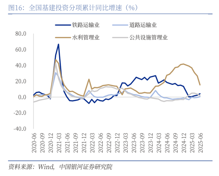 水利投资拖累下整体基建增速下滑,年内基建投资动能持续走弱。1-6月狭义基建投资累计增速4.6%,较上月回落1.0个百分点。估算当月投资增速1.96%(前值5.1%),基建投资增速回落3.1个百分点。其中水利投资连续5个月下滑,1-6月累计增速15.4%,较前值的26.6%大幅下滑11.2个百分点;铁路投资本月增速延续上行趋势,增长1.9个百分点至4.2%;公共设施投资增速进一步下滑;道路投资增速回正,上半年实现0.6%的增速。从资金端来看,今年政府债发行前置,但考虑到化债因素后对实体经济实际拉动作用有限。1-6月政府债累计融资7.6万亿元,较去年同期多增约4.3万亿元,但地方专项债在化债因素下对实体经济实际拉动作用有限,对应基建投资动能持续走弱。从经济结构转型上看,传统基建投资动能不足。一方面土地成交低迷和房地产施工疲软对基建整体形成压力,另一方面随着经济转型升级,资金正优先投向科技创新、新质生产力领域而非传统基建,传统基建投资动能不足。