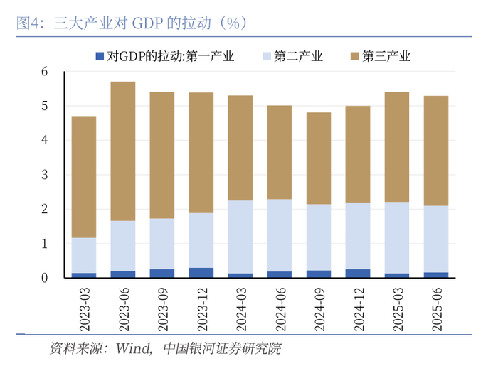 三季度可能处于物价回升、经济增速回落的过程。首先,7月开始的反内卷会带动下游部分产能缓慢出清,供给相对减少。其次,三季度企业补库存有所上行,下游需求的上行带动了价格的上行。7月份开始下游硅料价格上行,带动中游的多晶硅和上游工业硅价格走高,黑色产业链的反内卷行动使得焦煤、焦炭、铁矿石等价格回升。最后,中美贸易争端的不确定性减弱,厂商已经调整其出厂价格,出口价格可能进入相对稳定期。出厂价格在三季度有所回升,从而带动GDP平减指数上行,带来实际GDP的下降。要注意这种组合并不是“滞胀”组合,而是经济健康成长的组合。