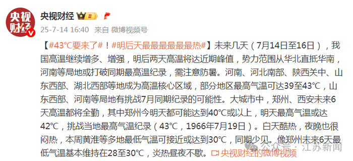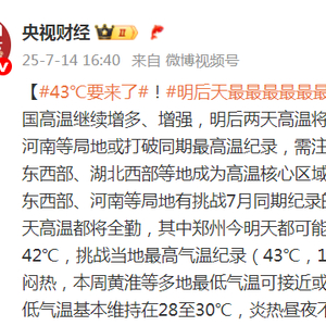 据央视财经:河南、河北南部、陕西关中、山东西部、湖北西部等地成为高温核心区域,部分地区最高气温可达39℃至43℃,山东西部、河南等局地有挑战7月同期纪录的可能性。