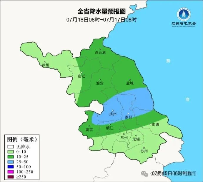 7月15日08时至7月16日08时,淮北地区多云转阴有阵雨或雷雨,局部雨量中到大雨,其他地区多云到阴,午后有分散性阵雨或雷雨。