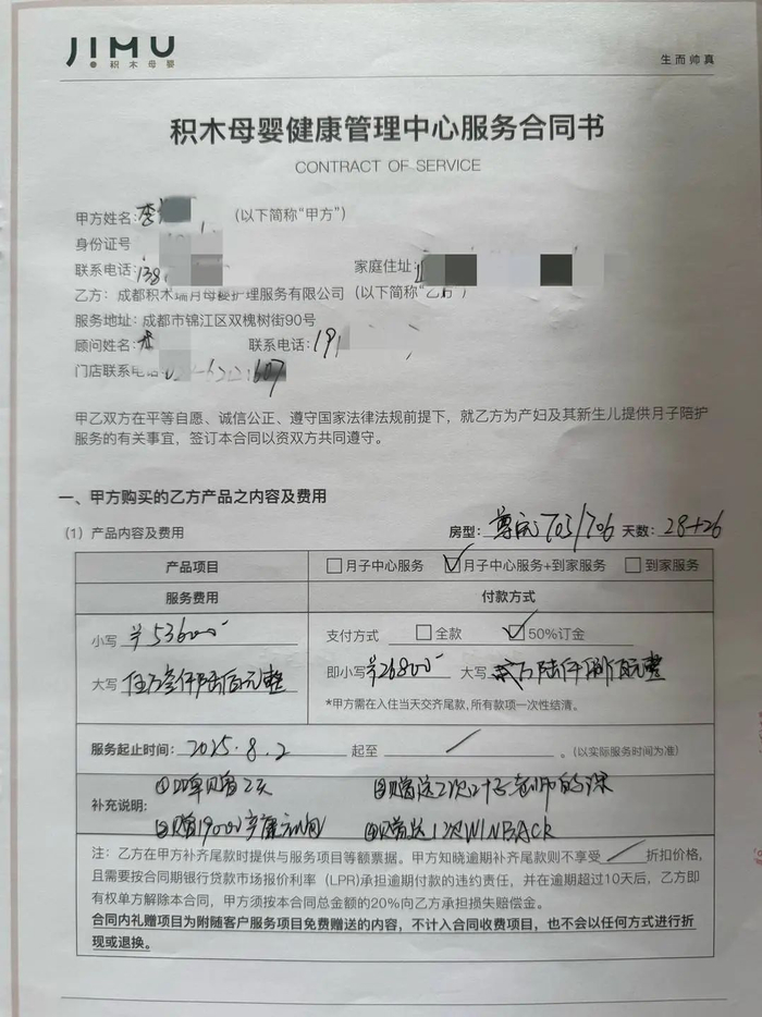 双方沟通很顺利,2月10日,她与月子中心签订了30天月子护理+26天专护到家的服务合同,合同价53600元,预付定金26800元。