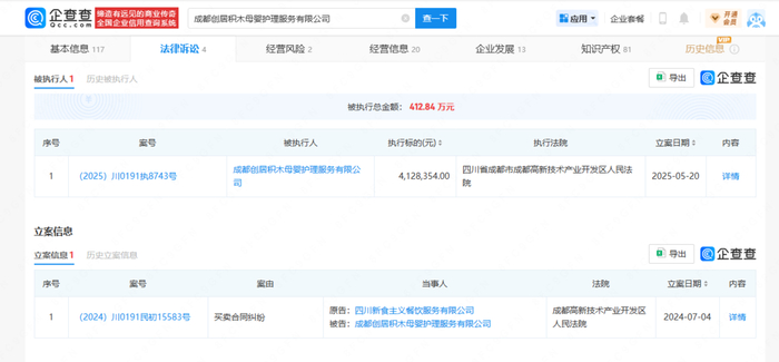 记者通过企查查搜索发现,今年5月20日,该月子中心母公司成都创居积木母婴护理服务有限公司被成都高新法院列为失信被执行人,执行标的超412万元。