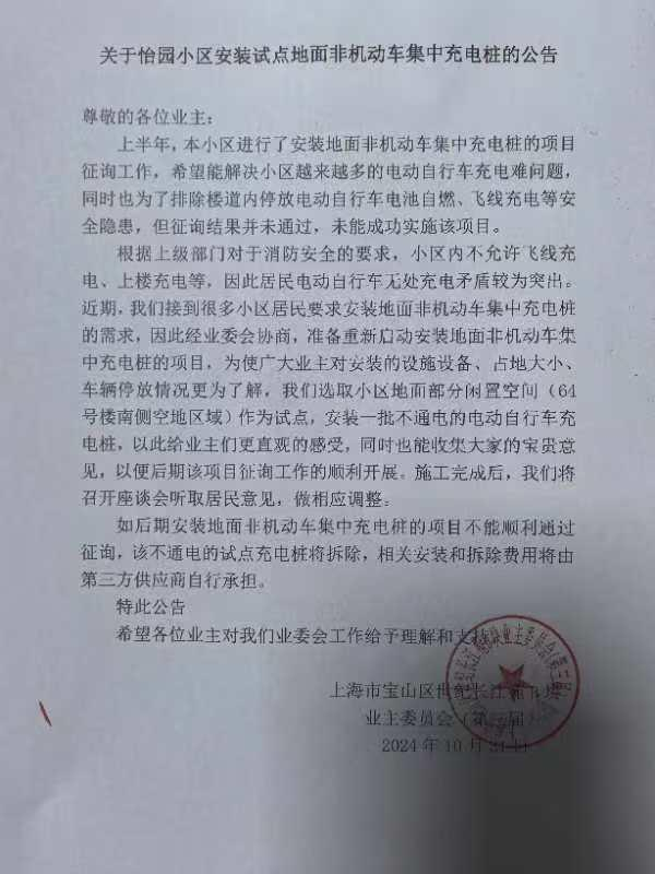 新民晚报记者采访该小区居民及“三驾马车”时,有关人员透露,早在2024年以前,为解决小区越来越多电动自行车充电难问题,排除楼道内电动自行车电池自燃、飞线充电等安全隐患,该小区曾打算享受全额补贴政策安装充电桩,但事先未征询业主意见,安装行动在业主的质疑声中戛然而止。