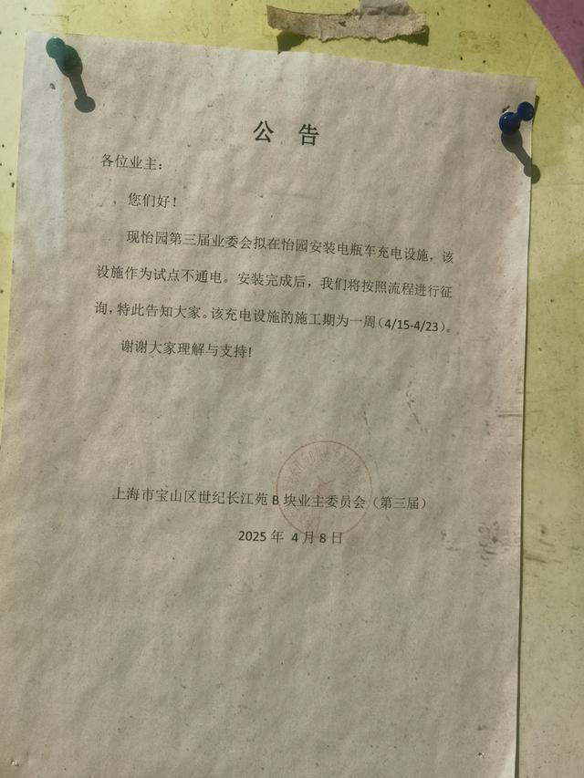 小区宣传栏贴着一张落款于今年4月8日的业委会公告。上面介绍称,这些充电桩于今年4月15日至23日施工,仅作为试点进行安装,安装完成后要按照流程征询业主们意见后再决定投用事宜。