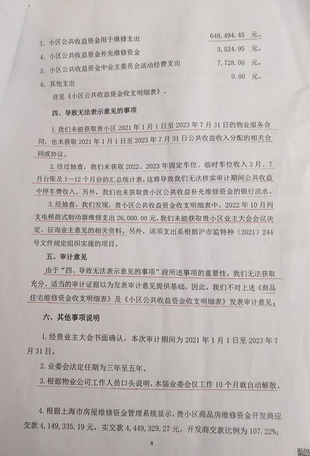 一份由专业机构于2024年9月出具的“审计报告”则称,审计时未能获取2021年1月1日至2023年7月31日的物业服务合同及其间公共收益分配的相关合同或协议,也未获取2022年、2023年固定车位、临时车位收入,3月、7月台账及1—12月的汇总统计表,更未获取小区公共收益中补充维修资金的银行流水,无法对其间的停车收入进行审计。