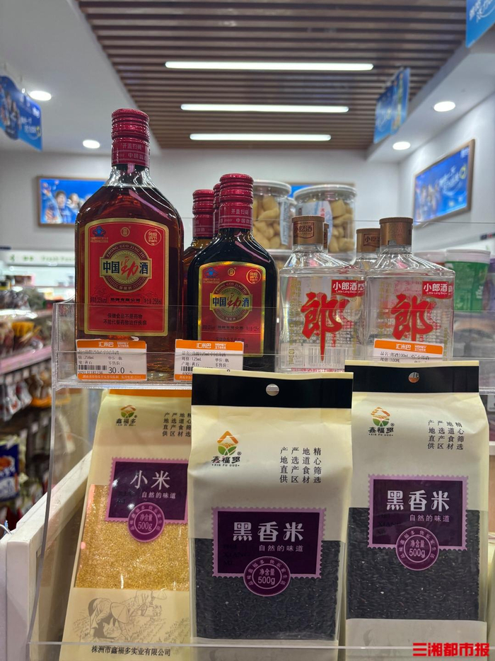 在芙蓉中路一写字楼内的汇米巴便利店内,最上方一排货架的劲酒和郎酒摆在一起进行售卖。该店附近的一家美宜佳便利店,劲酒则同其他几款韩国果酒放在同一排货架,均未按照规定分开摆放并标注其为保健品。此外,在新佳宜(富兴时代店)收银台前方的货架上,保健食品“中国劲酒”和普通食品“茅头小子”被摆放在一起,没有进行有效的分区。