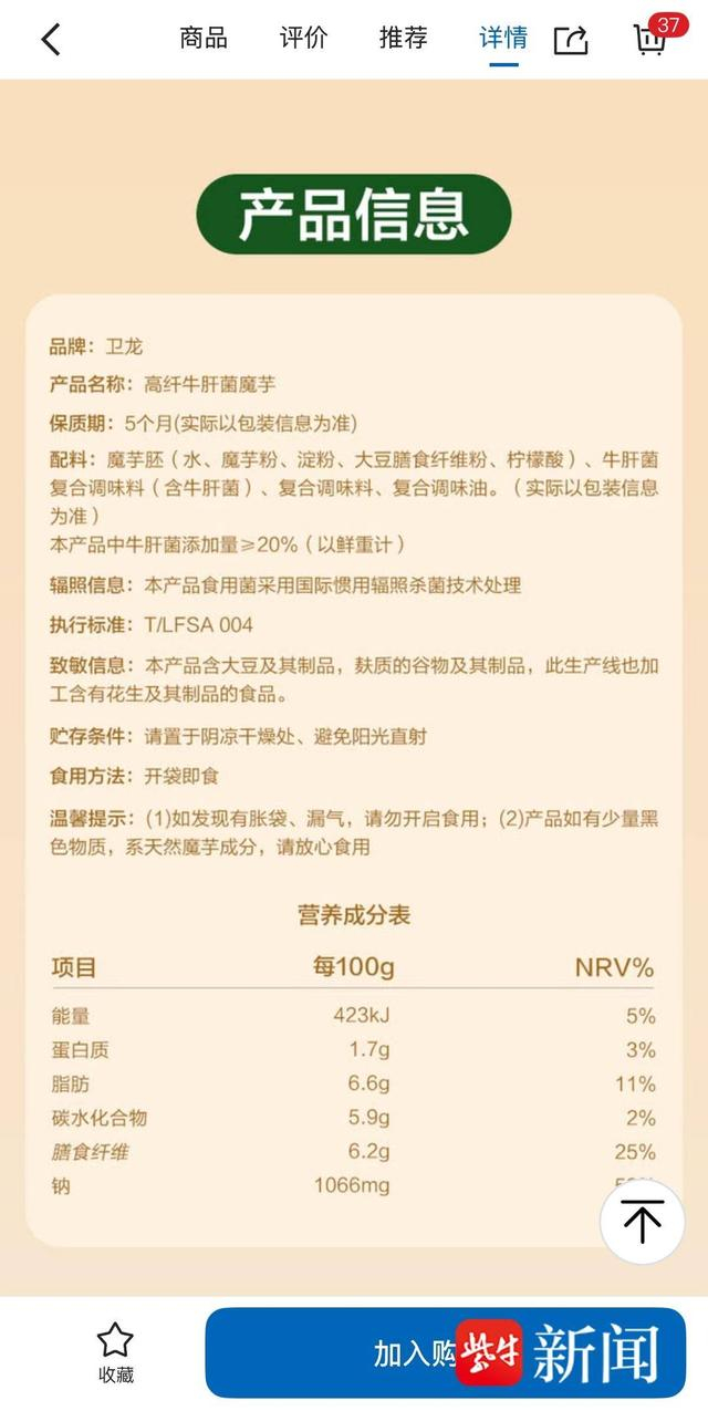 7月15日,扬子晚报/紫牛新闻记者在山姆会员商店APP中输入“卫龙”进行搜索,找到了这款“高纤牛肝菌魔芋”。不过,产品标题以及封面图片上,均未出现“卫龙”字样。待查看产品详细信息时,才明确其品牌为“卫龙”。在消费者评价区,有网友晒出的产品实物包装上,清晰印有“卫龙”商标。
