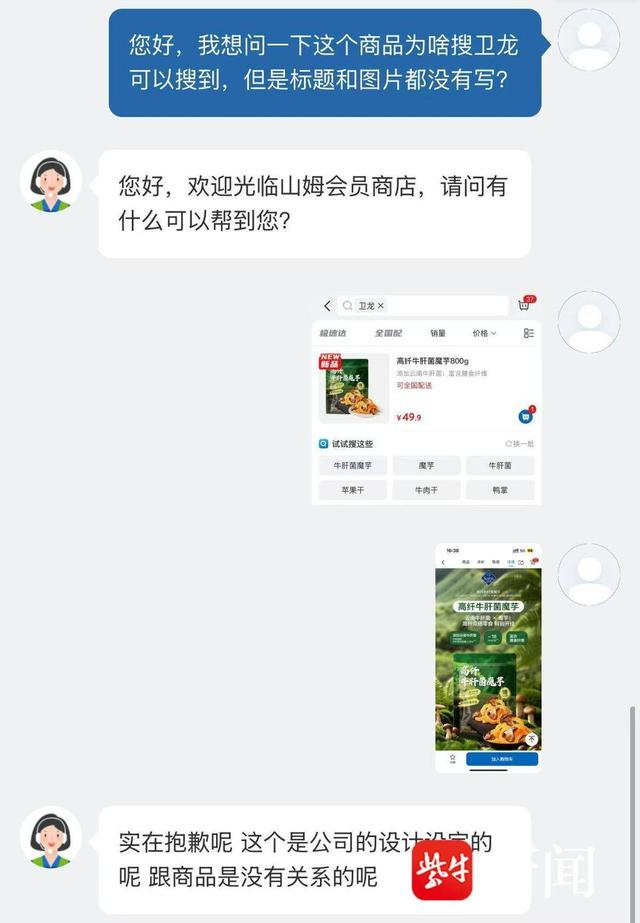 针对这一情况,记者以消费者身份拨打了山姆会员商店客服电话。客服人员证实,这款“高纤牛肝菌魔芋”确实来自卫龙品牌,品牌详情中也有明确标注。但当记者追问“为何封面和标题未标明卫龙品牌”时,客服人员并未给出解释。