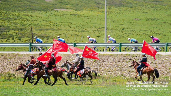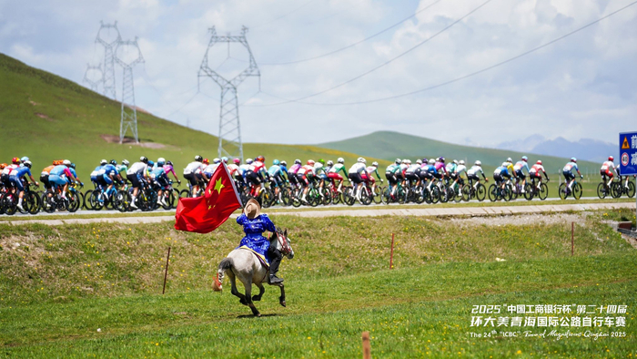 在青海湖畔,牧民们手擎国旗策马飞驰,与选手们并肩竞逐。这一场景也致敬了全球顶尖自行车赛事环法自行车赛中自行车与马匹同行的经典画面——骑马承载着人类悠久的出行记忆,自行车则象征着现代的绿色出行理念,此刻,在青海湖畔,传统与现代完美交融,共同谱写着人与自然和谐共处的动人篇章。