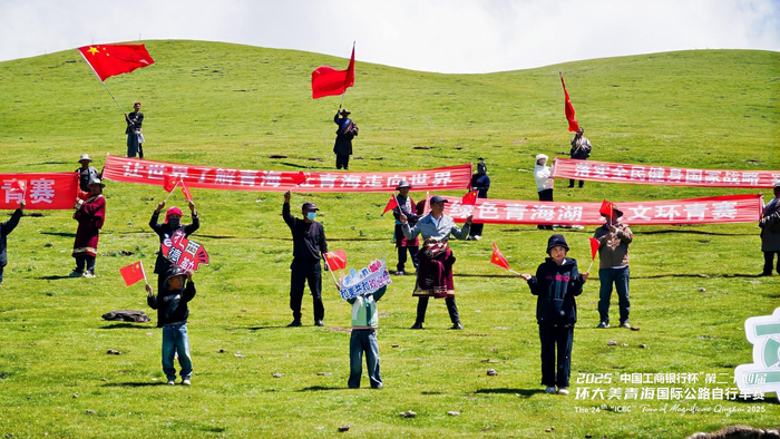 图为环青赛期间,沿途的群众、小朋友们手持“让世界了解青海 让青海走向世界”“绿色青海湖 人文环青赛”等标语的横幅,用灿烂的笑容和真挚的欢呼,向世界展示着青海人民的开放与好客,飘扬的横幅与欢呼声交织,传递出这片土地对八方来客最热烈的欢迎。