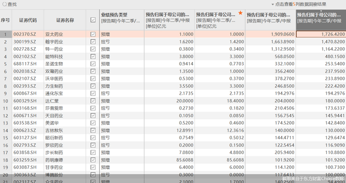 此外,包括通化东宝在内,有翰宇药业、莎普爱思、天目药业等7股实现扭亏。以翰宇药业为例,公司预计上半年实现归属净利润约1.42亿元至1.62亿元,比上年同期增长1470.82%至1663.89%。