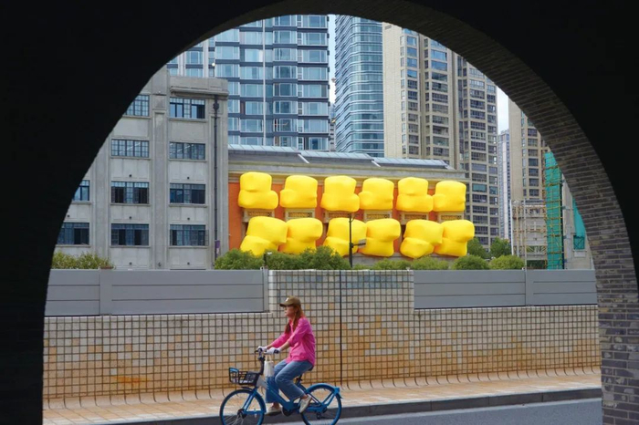 2024年10月24日,上海。文安路 30 号苏河皓司外墙上的黄色充气艺术装置引人注目。(图/IC photo)