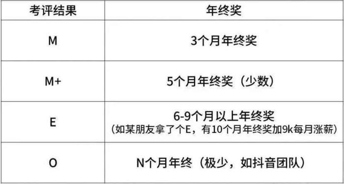 在此之前,字节的绩效有F、I、M-、M、M+、E、E+、O这8个等级,具体字母含义如下:F(Failed,不及格),I(Improving,改善),M(Medium,中等),E(Excellent,优秀),O(Outstanding,杰出)。不过一般情况下只会有中间四个等级,极低和极高的都很少能够出现。