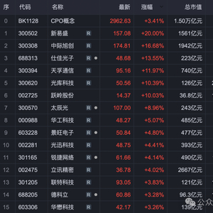 今日,算力、CPO、英伟达等 AI 产业链一路猛涨,“三剑客”易中天全线爆发,新易盛20cm涨停,中际旭创涨逾16%,天孚通信涨近12%。