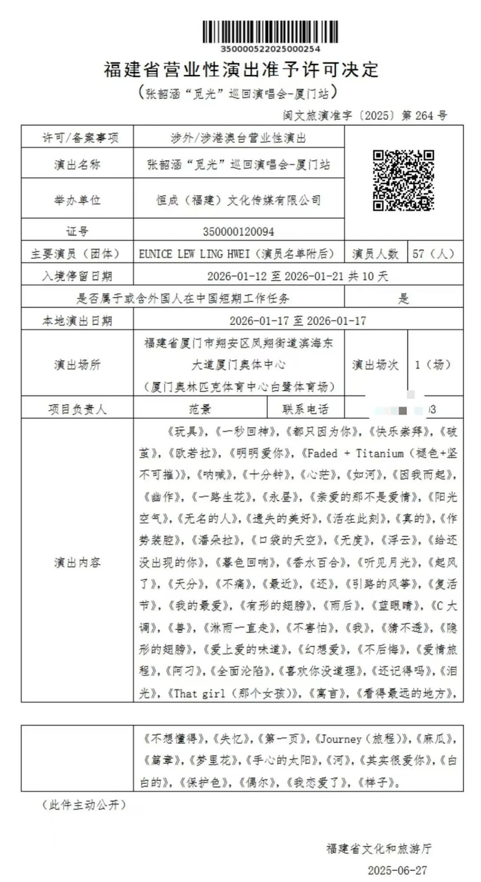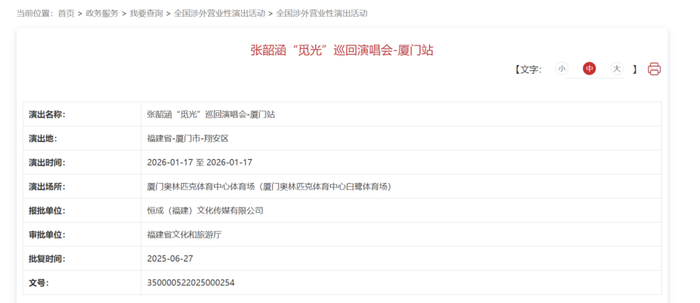 根据文旅部最新发布的审批公示:张韶涵“觅光”巡回演唱会-厦门站审批已经通过!开票还需一段时间,敬请期待!