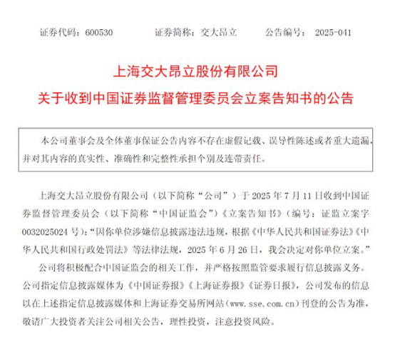 7月12日(周六),交大昂立突发公告,公司11日收到中国证监会《立案告知书》,因涉嫌信息披露违法违规,公司被立案。
