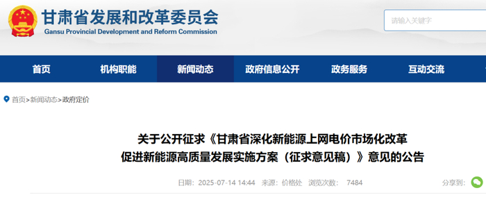 为贯彻落实《国家发展改革委 国家能源局关于深化新能源上网电价市场化改革促进新能源高质量发展的通知》(发改价格〔2025〕136号)要求,结合甘肃实际,省发展改革委牵头起草了《甘肃省深化新能源上网电价市场化改革促进新能源高质量发展实施方案(征求意见稿)》,现面向社会公开征求意见。