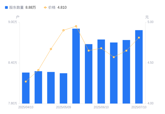 近一年(2024年7月10日至2025年7月10日),中泰化学A股股东户数从10.13万户,减低至8.88万户,降幅12.33%,区间股价上涨21.77%。