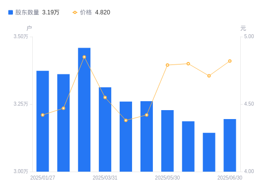 近一年(2024年6月30日至2025年6月30日),科顺股份A股股东户数从3.43万户,减低至3.19万户,降幅6.81%,区间股价上涨22.93%。