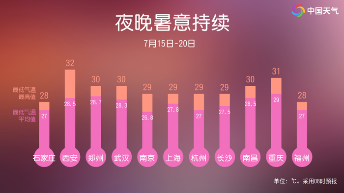 像明天,华北南部以南大部地区最低气温都普遍超过25℃,陕西关中、河南中南部、山东西部、江苏中部、湖北中部、湖南北部、重庆西南部等地最低气温将达到或超过30℃。