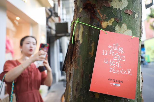 小红书“马路生活节”期间,淡水路上的梧桐树上,绑着小红书博主的投稿作品。