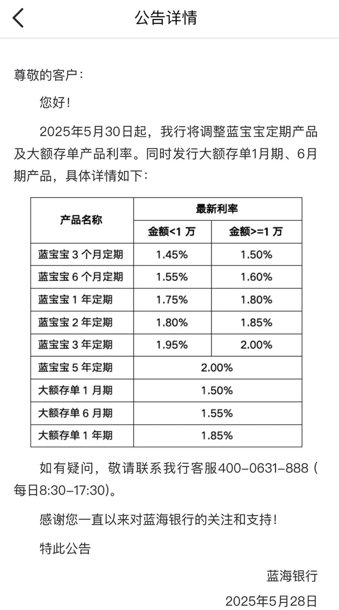 2025年上半年,蓝海银行连续八次下调存款利率,在民营银行之中较为少见。最近一次发生在6月末,该行将7天通知存款年利率下调至1.25%。